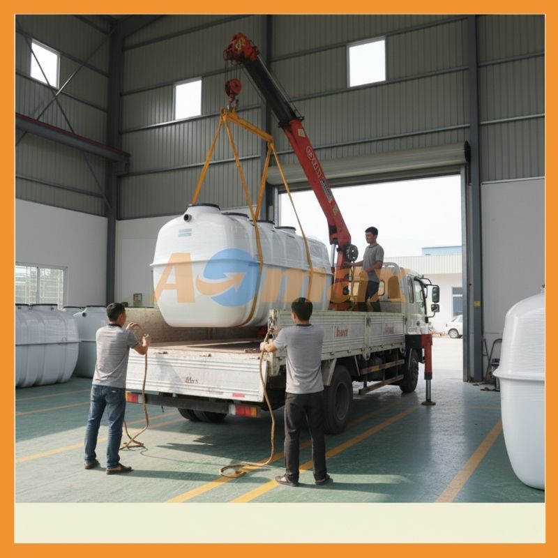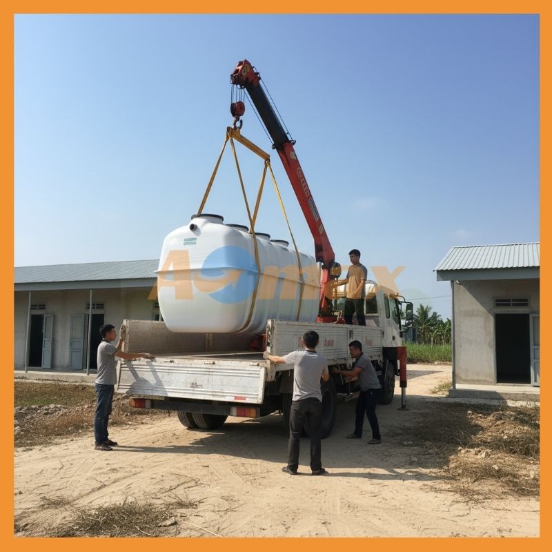 Một rào cản lớn khi thi công các loại bể phốt thông thường là tải trọng quá nặng, đòi hỏi máy xúc, cần cẩu phức tạp, đặc biệt khó khăn khi thi công trong ngõ hẹp. Trái lại, bể tự hoại composite 4m3 có trọng lượng vô cùng nhẹ (chỉ bằng khoảng 1/10 so với bể bê tông cùng thể tích). Thiết kế nguyên khối gọn gàng giúp quá trình vận chuyển, cẩu hạ và lắp đặt diễn ra chỉ trong vài giờ đồng hồ.