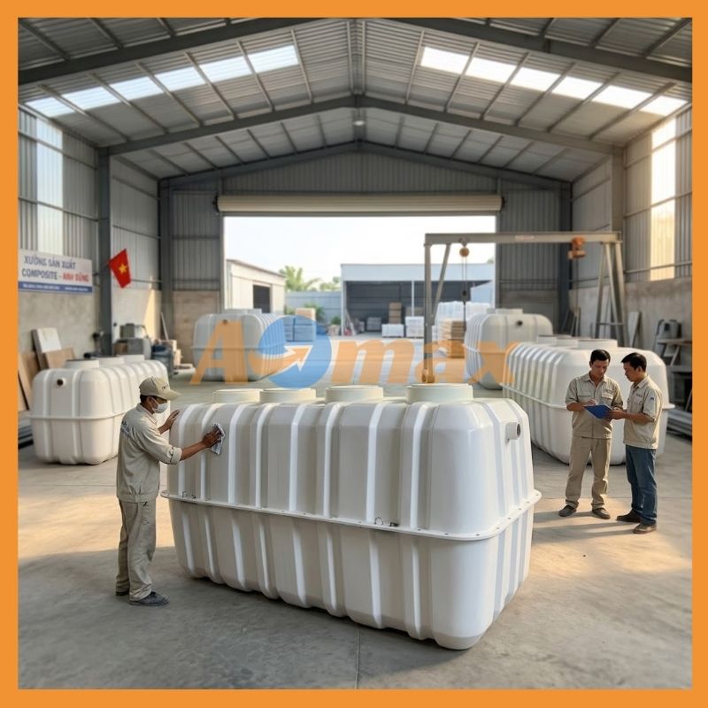 Mỗi một chiếc bể tự hoại Composite 8m3 trước khi xuất xưởng đều phải trải qua quy trình KCS (kiểm tra chất lượng) vô cùng nghiêm ngặt: kiểm tra độ dày thành bể, thử nghiệm áp suất chịu lực, kiểm tra độ kín nước... AOmax cam kết cung cấp sản phẩm chính hãng, đầy đủ giấy tờ chứng nhận xuất xưởng (CO, CQ), đảm bảo chất lượng tốt nhất thị trường.