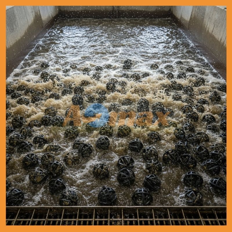 Đây là ứng dụng phổ biến và mang lại hiệu quả cao nhất. Giá thể vi sinh cho bể MBBR (Moving Bed Biofilm Reactor) và IFAS hoạt động dựa trên nguyên lý lơ lửng liên tục. Nhờ máy thổi khí dưới đáy bể, giá thể vi sinh dạng cầu D50 sẽ chuyển động không ngừng, giúp lớp màng sinh học tiếp xúc tối đa với chất hữu cơ và oxy. Tỷ lệ lấp đầy khuyến nghị trong bể phản ứng thường dao động từ 25% đến 50% thể tích bể, tùy thuộc vào nồng độ ô nhiễm của dòng thải.
